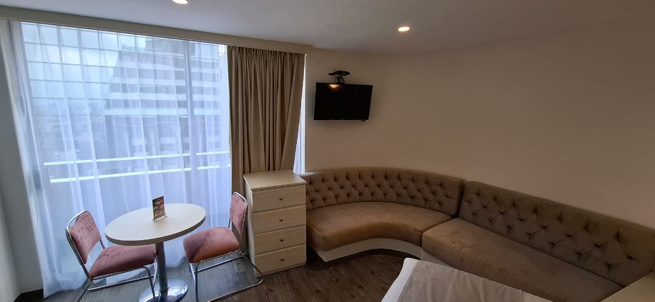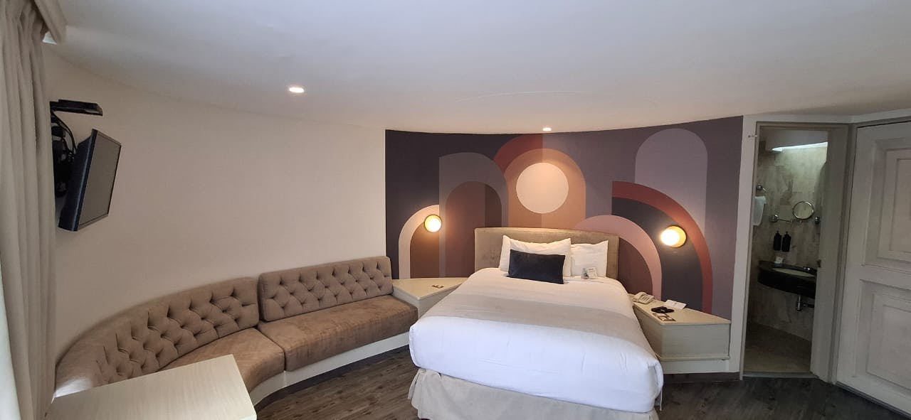 Room with a Queen Size bed. Table for two people. Small armchair. Coffee kit in the room. Private balcony. Cable TV. Private bathroom with marble Roman tub and shower. Safe box. Iron and ironing board.
